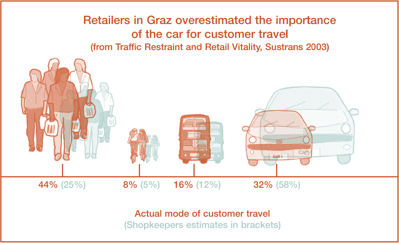 A misconception of how people are arriving at shopping destinations is not uncommon: a perception survey of businesses in Bristol found they overestimated arrivals by car by 100%. A similar survey in Waltham Forest showed an overestimation of a staggering 300%.
