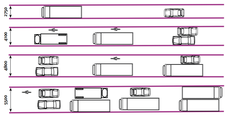 Where flows of large vehicles are low, and speeds are modest (less than 35mph), lane widths as narrow as 2.75m can accommodate car traffic comfortably. Larger vehicles can pass one another at this width at lower speed with care, although some drivers may choose to encroach slightly outside of lanes to pass (i.e. into an advisory cycle lane). Lanes below 3.0m (2.75m if few busesor HGVs) require agreement with the Traffic Manager.