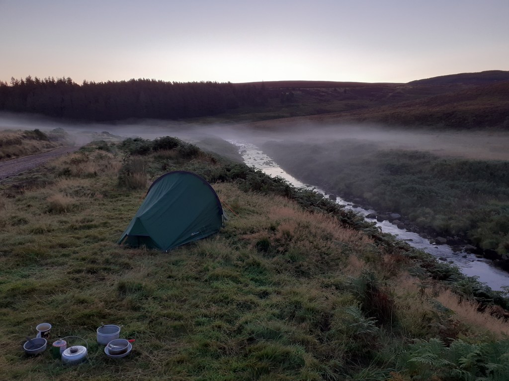 Woken again to grouse calling (happily no answering guns). After my usual porridge breakfast, I had a steep climb but was rewarded by spectacular views across the Howe of the Mearns and to the sea! A long, long descent took me away from the Cairngorms, and then minor ‘lumpy’ roads west to Glen Clova – a picture-perfect Scottish glen with a lovely hotel at the end for a well-timed cuppa. I began my search for a camping spot which was a lovely feeling as the day visitors headed home…