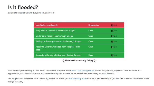 Heather uses the Is It Flooded? site before setting out. A Cycle Campaign member devised this to give an indication if a riverside route is under water. It does note “paths may still be unusably silted even if they are clear of water”.