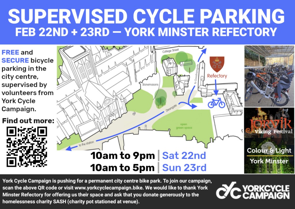 We’ll be holding the third of our secure cycle parking pop-ups in a space generously donated by York Minster Refectory to coincide with York Viking Weekend. If you can help supervise the area and register users please send us your availability (day(s) + time(s) during weekend 22nd (10am-9pm) /23rd (10am-5pm) February – max 2 hour shifts) and your mobile contact number so we can create a rota. There will always be at least one other helper present. In case of bad weather, there is a covered area.