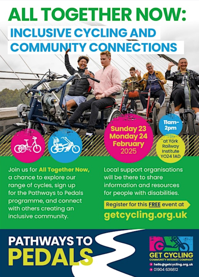 Get Cycling is hosting a 2-day event to bring people of all abilities together to enjoy cycling. Sunday is a day for people with disabilities to find out more about the range of cycles available, and Monday is for organisations to learn more about the potential of inclusive cycling. YCC will be holding a stall on both days (11am-2pm) and if you can help staff it please let us know. For those seeking tips on how to choose a bike if a standard cycle isn’t appropriate, Wheels for Wellbeing has written a two-part blog (Part 1 and Part 2).