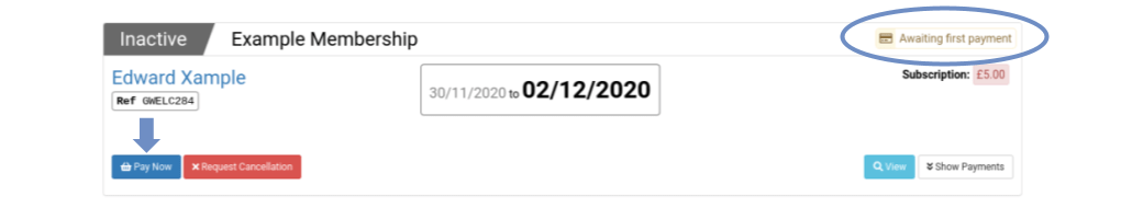 If your membership is showing as Inactive with Awaiting first payment then you’ve previously either registered for a membership or accepted a renewal but it’s not recorded as paid.